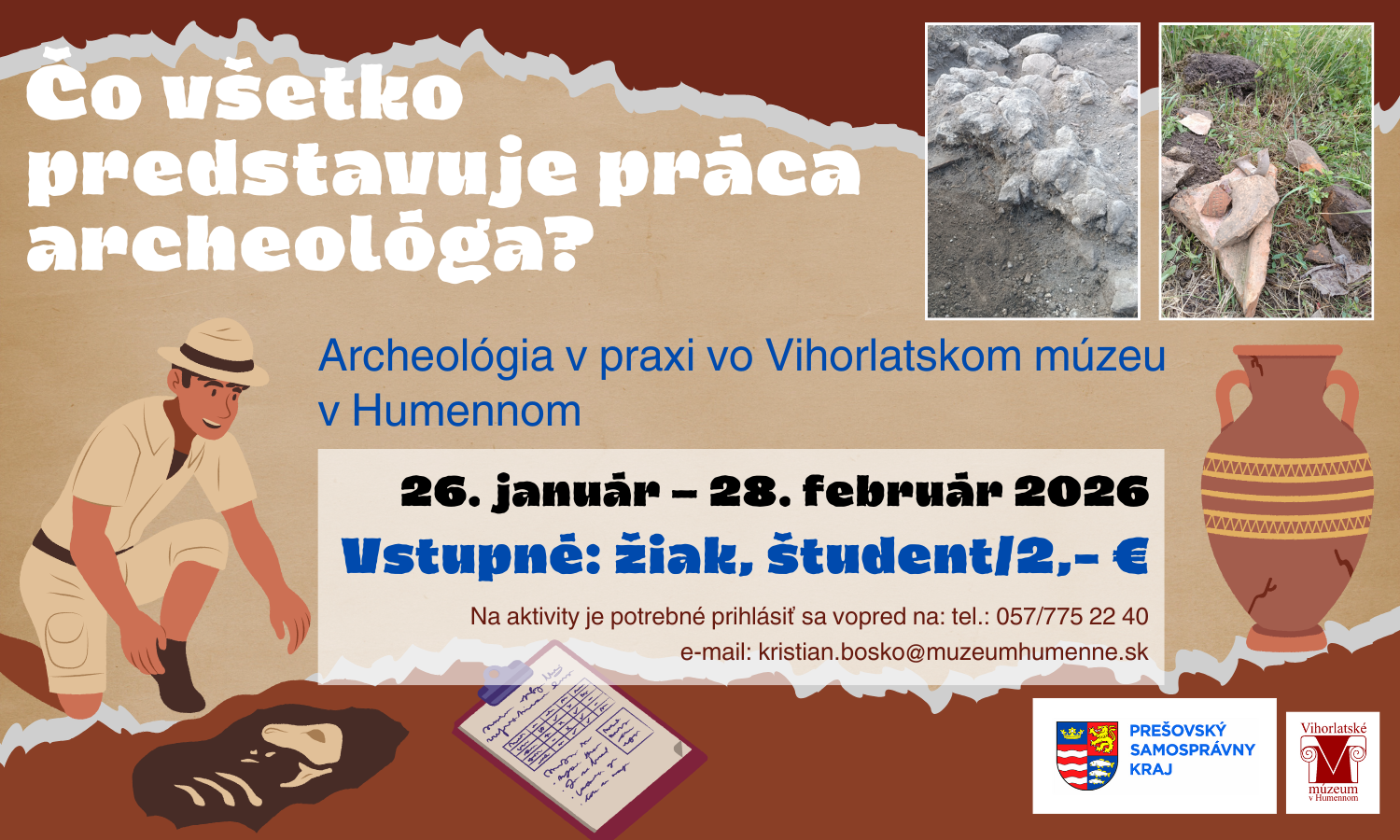 Vihorlatské múzeum v Humennom srdečne pozýva študentov základných a stredných škôl na prednášku s názvom Archeológia v praxi: čo všetko predstavuje práca archeológa? Prednáška približuje svet archeológie a odhaľuje, čo všetko predstavuje práca archeológa a ako prebieha archeologický výskum - od hľadania vhodnej lokality, cez terénne výkopy a dokumentáciu, až po laboratórne analýzy a interpretáciu výsledkov. Študenti získajú aj praktické informácie o možnostiach štúdia archeológie a kariéry v tomto odbore. Podujatie je doplnené o fotografie z výskumov, diskusiou, aby si študenti odnášali nielen poznatky, ale aj zážitok z poznávania minulosti.
