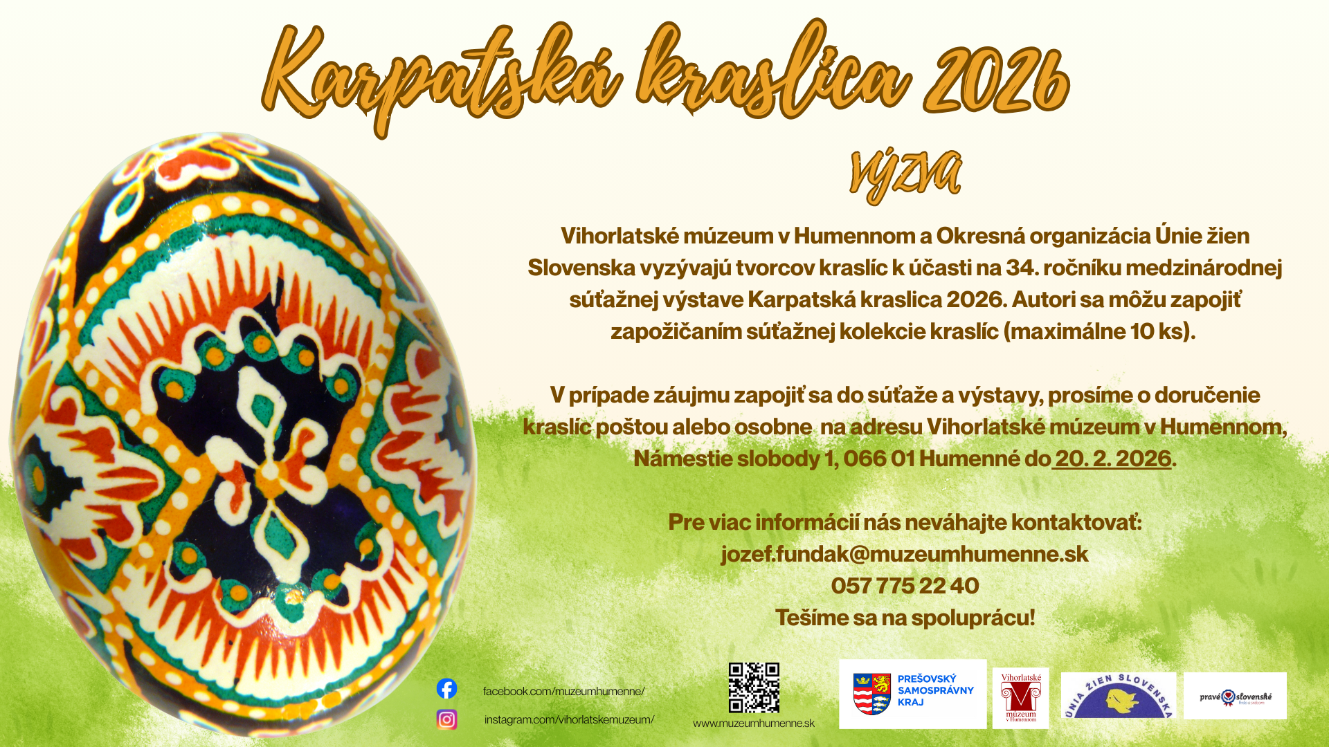 Vihorlatské múzeum v Humennom a Okresná organizácia Únie žien Slovenska vyzývajú tvorcov kraslíc k účasti na medzinárodnej súťažnej výstave Karpatská kraslica 2026. Autori sa môžu zapojiť zapožičaním súťažnej kolekcie kraslíc (maximálne 10 ks).